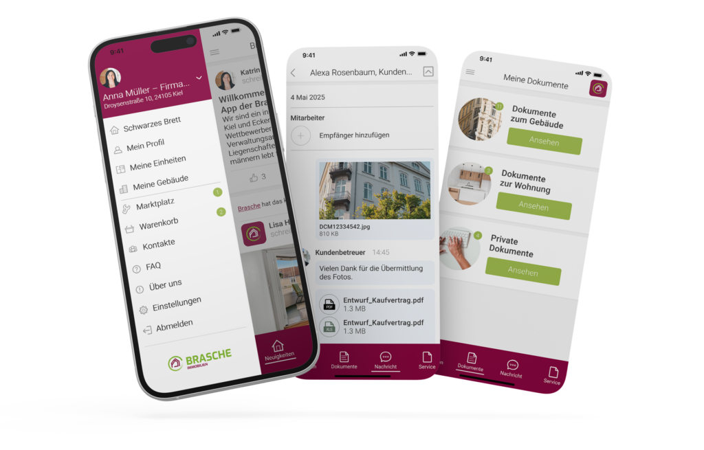 Mit der Brasche-Home-App nutzen Sie unseren modernen Kundenservice ganz flexibel: Melden Sie uns Ihr Anliegen oder einen Schaden jederzeit bequem per Smartphone – inklusive Fotodokumentation. Zusätzlich stellen wir Ihnen eine digitale Dokumentenmappe mit allen wichtigen Unterlagen zu Ihrer Immobilie zur Verfügung. Über das digitale Schwarze Brett erhalten Sie aktuelle Informationen rund um die von uns betreuten Immobilien direkt per Push-Nachricht.